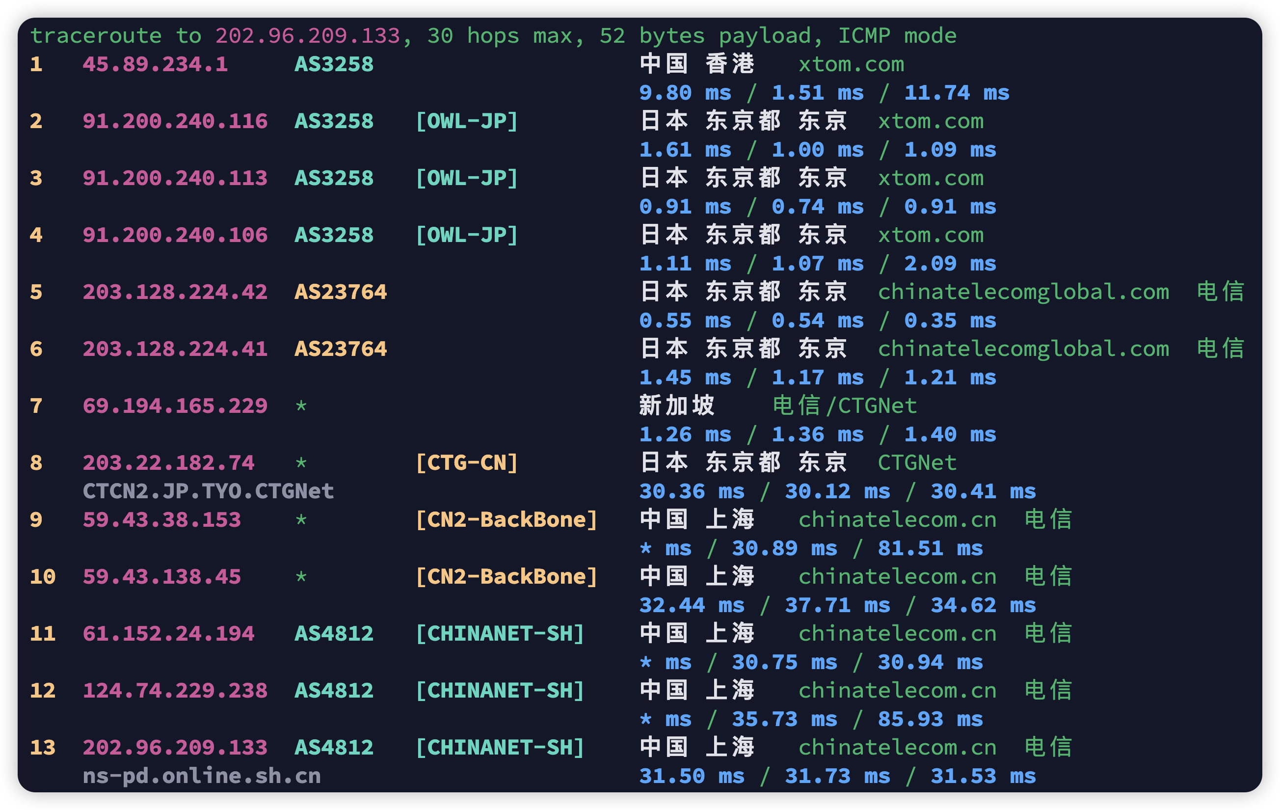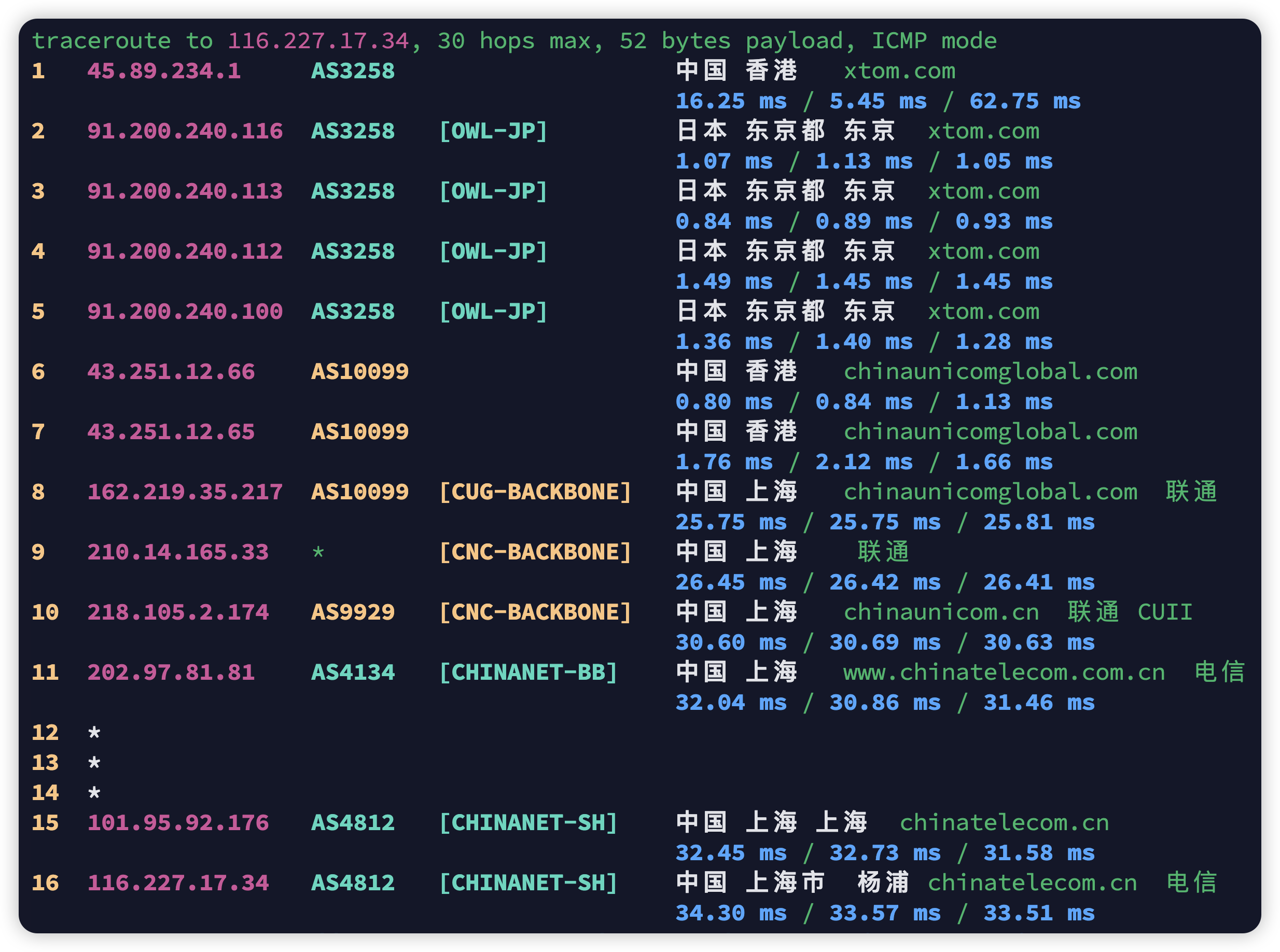 上海电信 V4双程CN2,上海联通 V4双程9929,上海移动 V4去程CMI回城CN2,上海电信 V6双程163,上海联通V6去程4837绕北京回程163绕广州,上海移动V6回程163直连(本地移动没有V6)。